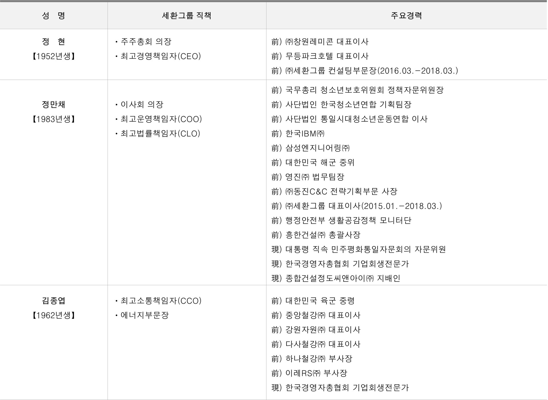 - 현재. 세환그룹 최고경영책임자(CEO)